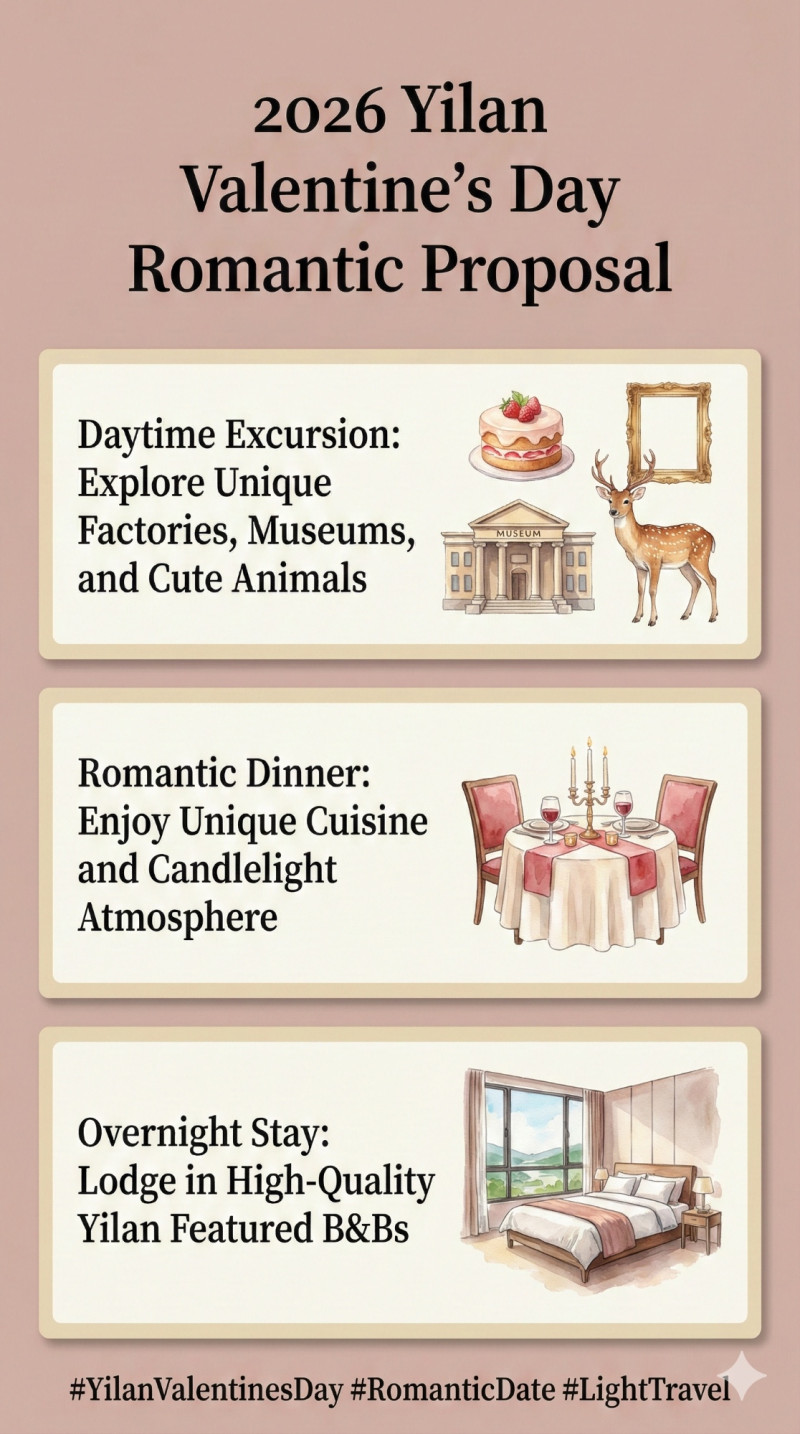 Valentine's Day is approaching—are you ready for this romantic moment? If you are in Yilan on that day, feel free to refer to the following itinerary to enjoy a wonderful time with your beloved effortlessly.Key highlights of 2026 Yilan Valentine's Day romantic proposals infographic.