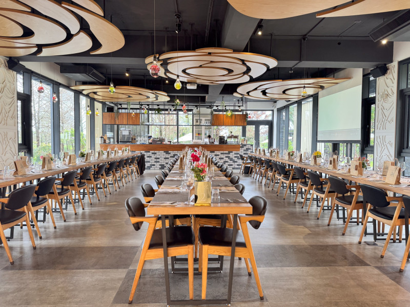 【餐廳區】適合人數約60人使用,四周採用全落地窗採光空間, 搭配木質桌面及石造地板, 簡約自然風格建議搭配花卉簡易佈置即可達到雅緻風格。可配置以三排長桌方式創造最大空間感,打造舒適用餐空間及環境。區域尺寸為:長1,262cm、寬 805cm。