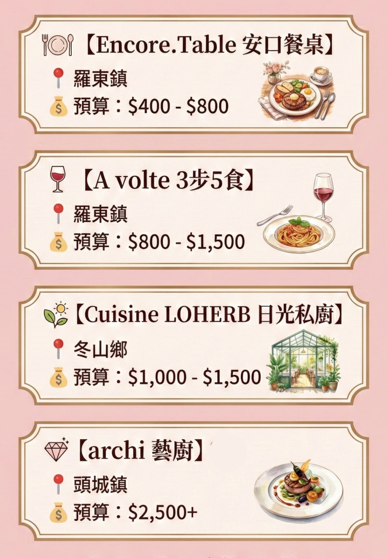 今年年末聚餐想找既有氣氛又令人難忘的餐廳?宜蘭這座風景與美食並存的城市,餐飲選擇琳瑯滿目,但若要不踩雷、留下好印象,這份清單絕對值得收藏。本篇精選了包括宜蘭羅東的【Encore.Table 安口餐桌】、正統義式料理【A volte 3步5食】、宜蘭特色法式料理【Cuisine LOHERB 日光私廚】與高端海洋義式餐廳【archi 藝廚】,讓你的聚餐不只有味覺驚喜,更有討喜的用餐環境與氛圍。