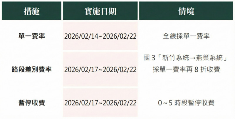 在2月17日至2月21日的不同時段將封閉部分高速公路匝道,包括國道一號、國道五號的部分南向入口及其他指定時段的北向入口。