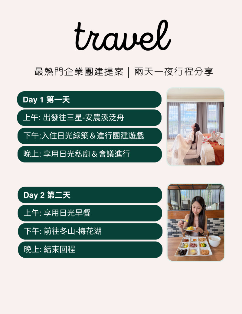 本次行程安排以宜蘭為主軸,第一天下午以安農溪泛舟開啟行程,透過水上挑戰活動加強團隊默契;下午則入住日光綠築,體驗質感住宿與法式料理。第二天安排輕旅行前往梅花湖,享受自然湖景與團隊腳踏車環湖,作為本次旅程的放鬆收尾。