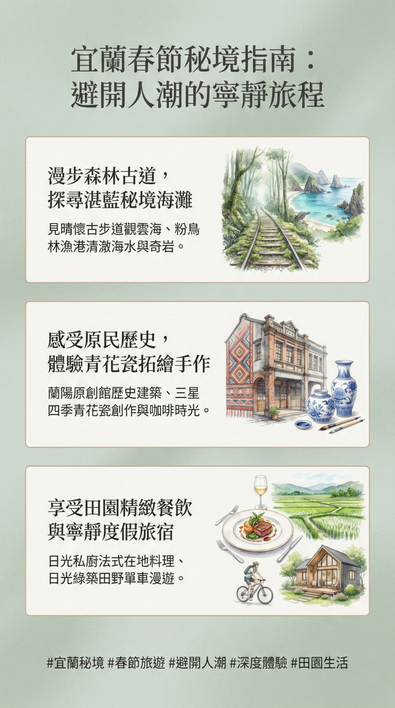 #宜蘭新年 #私房景點 #避開人潮 #隱藏美景 #自然探索 #宜蘭旅遊 #藝術探索 #宜蘭海岸 #寧靜度假 #日光綠築 #探險旅行 #日光私廚 #自然愛好者 #文化愛好者 #旅遊指南